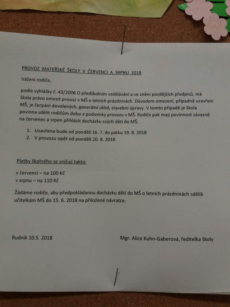 UZAVŘENÍ MATEŘSKÉ ŠKOLY V PONDĚLÍ 30.4.2018